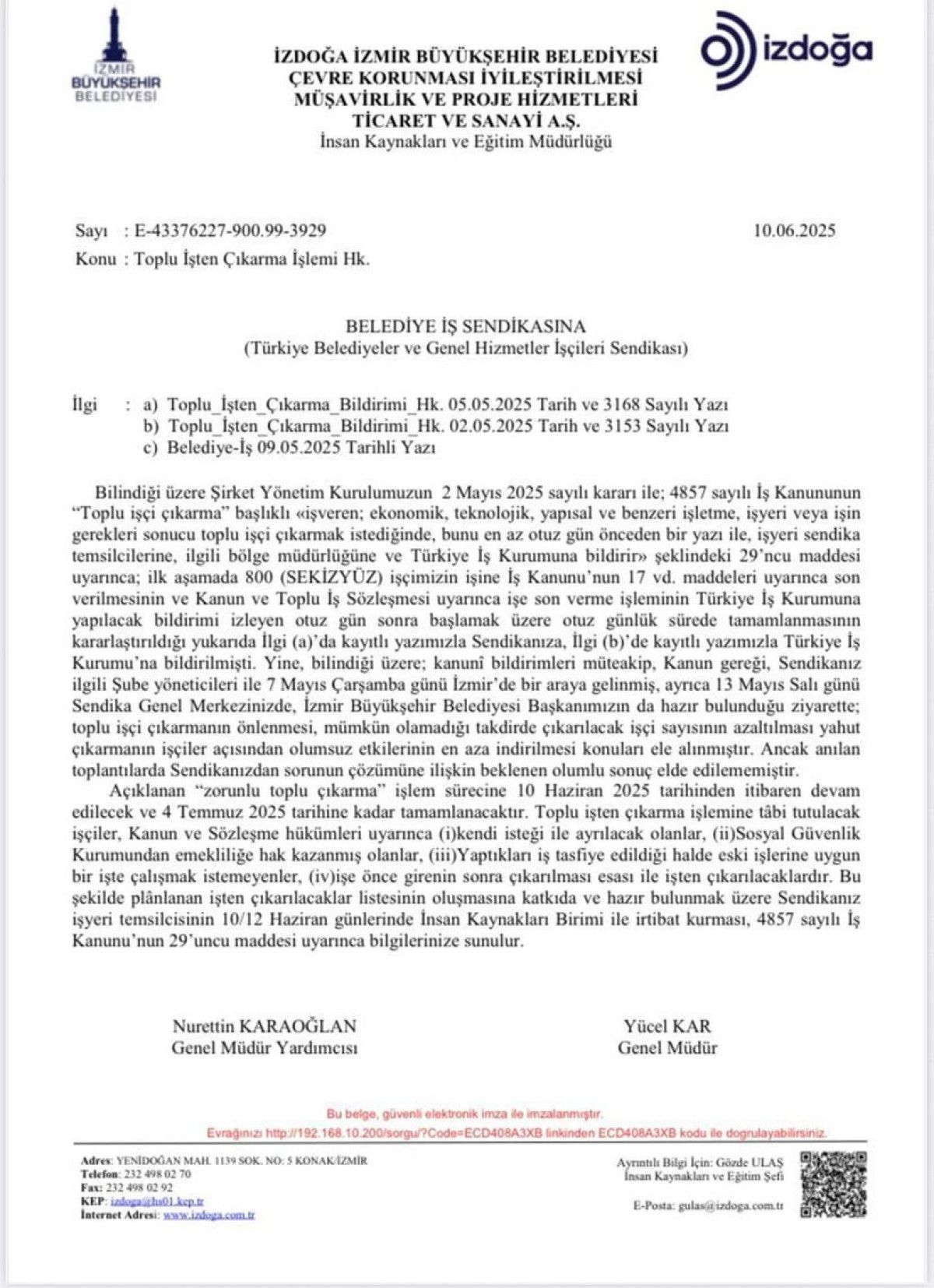 İZDOĞA’nın gönderdiği yazıya nazaran, 10 Haziran’da başlayan işten çıkarma süreci 4 Temmuz 2025’e kadar tamamlanacak.