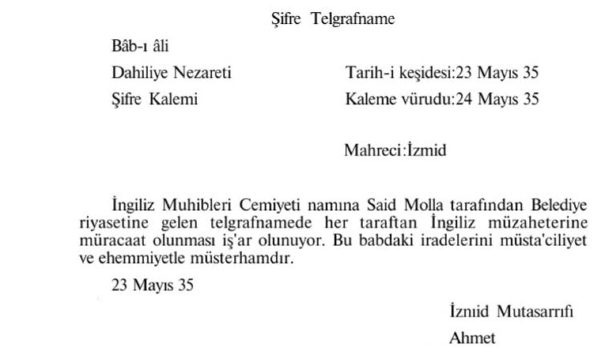 İşte bu anlayışın Osmanlı mülkündeki temsilcilerinden biri olan Sait Molla, böylesi tuhaf bir isimle cemiyetini kurmuştu. Molla, cemiyetin faaliyete geçişinden üç gün sonra bütün belediye başkanlıklarına bir telgraf göndererek, İngiliz Muhipleri Cemiyeti’nin halka anlatılıp, üye kazanılmasını istemişti. Molla ayrıyeten, “Halk, İngiliz Elçiliği’ne, gazetelere mektup yazıp, İngiliz taraftarlığını kurtuluş yolu olarak gördüklerini anlatsın.” diyordu.